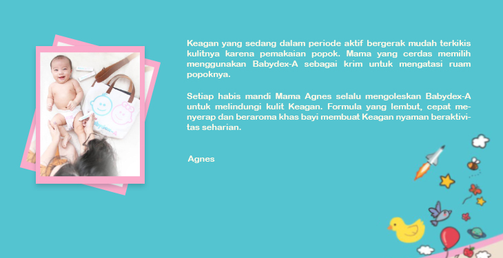 Children’s skin problem such as rashes, dry skin and so on can be caused by several factors such as weather, insect bites, pollution to dust. So, that's why Charis's mother always tries to maintain her health, like regularly using Babydex-A MS.